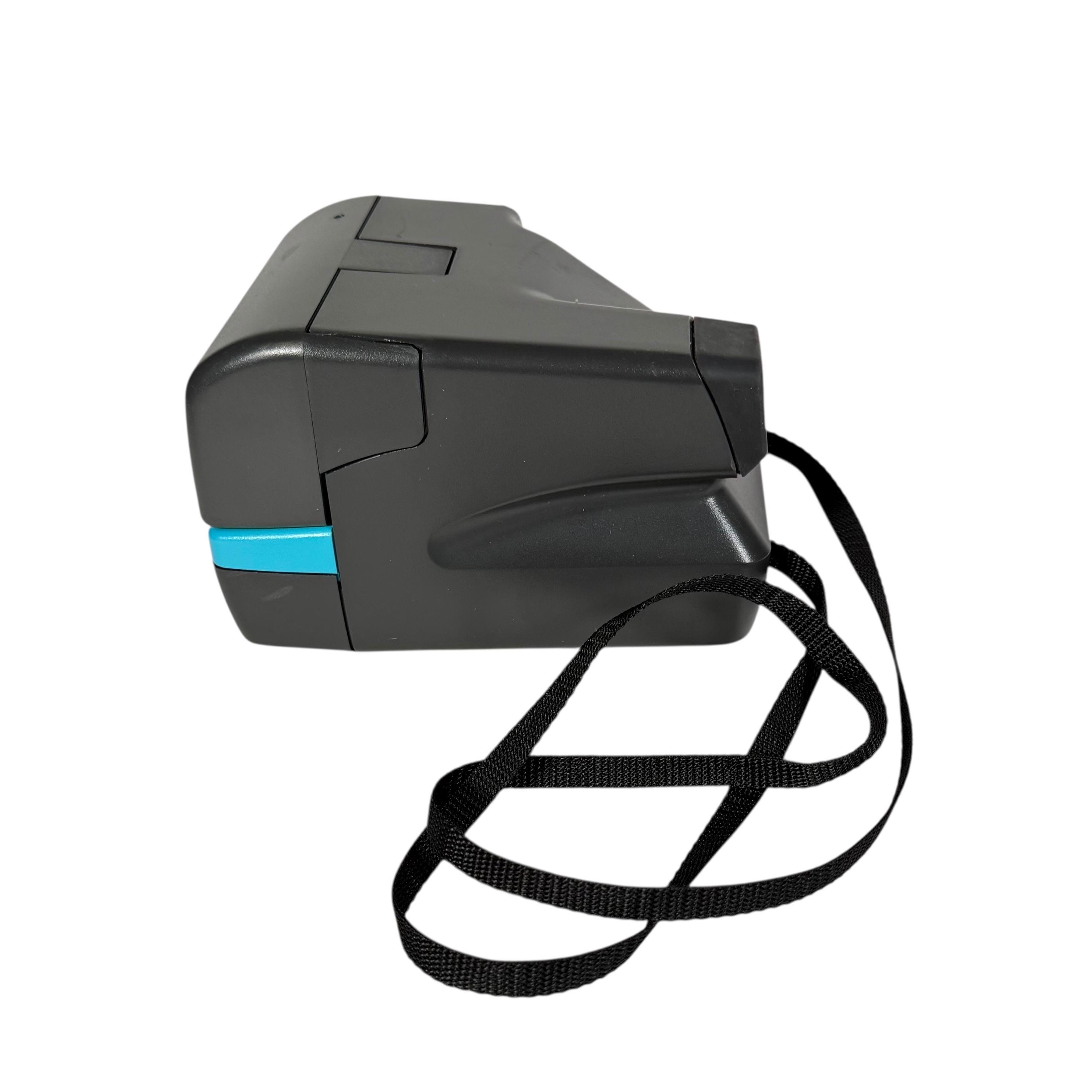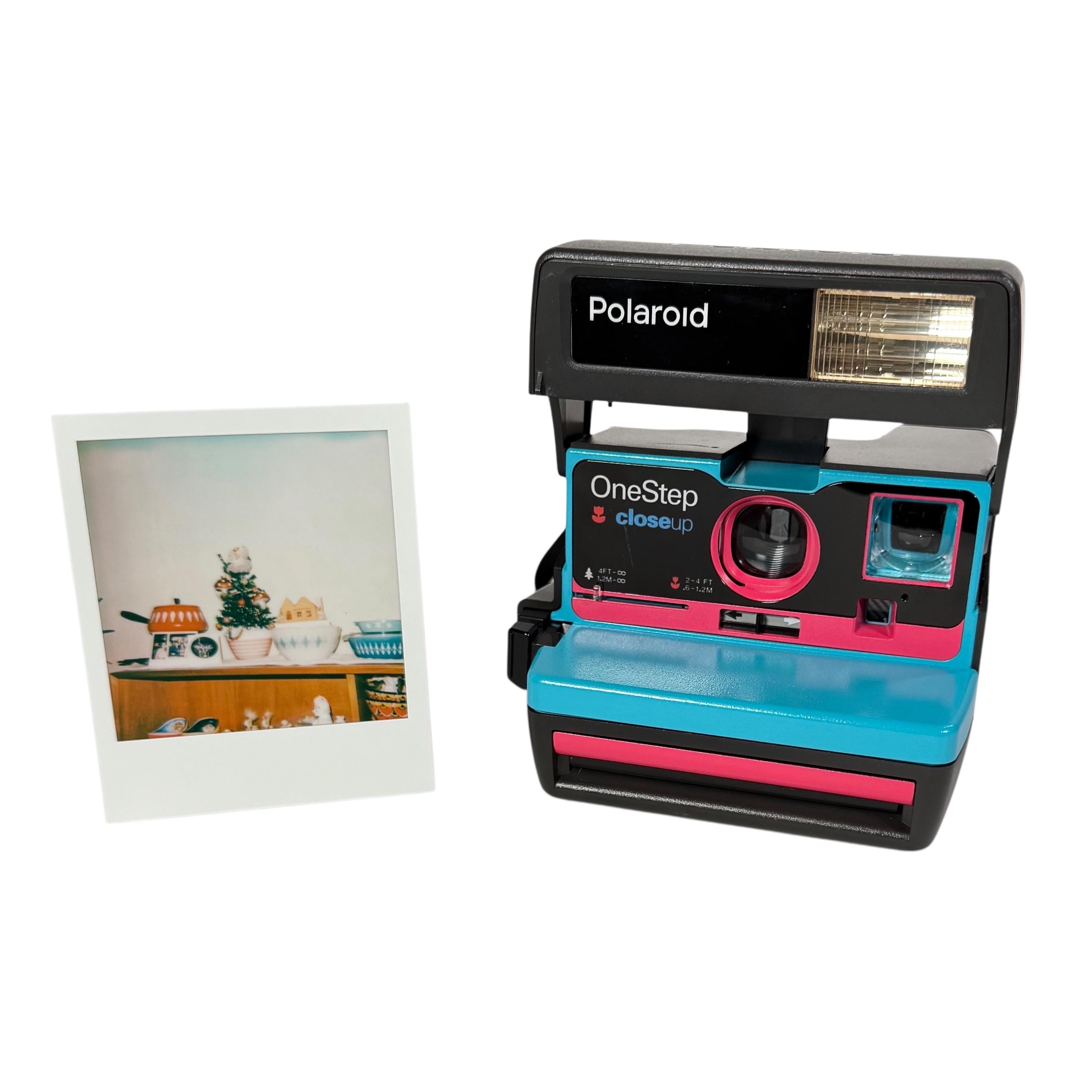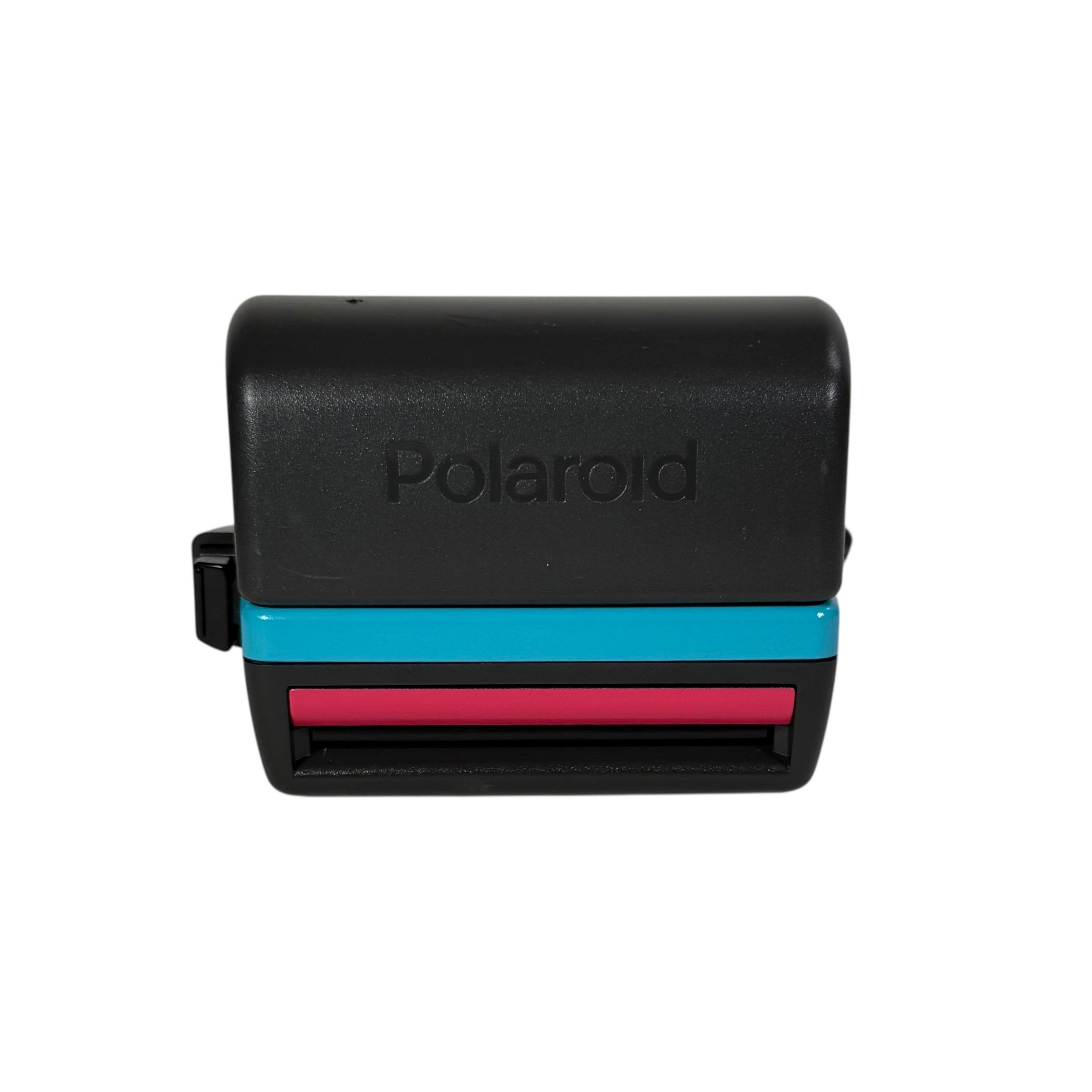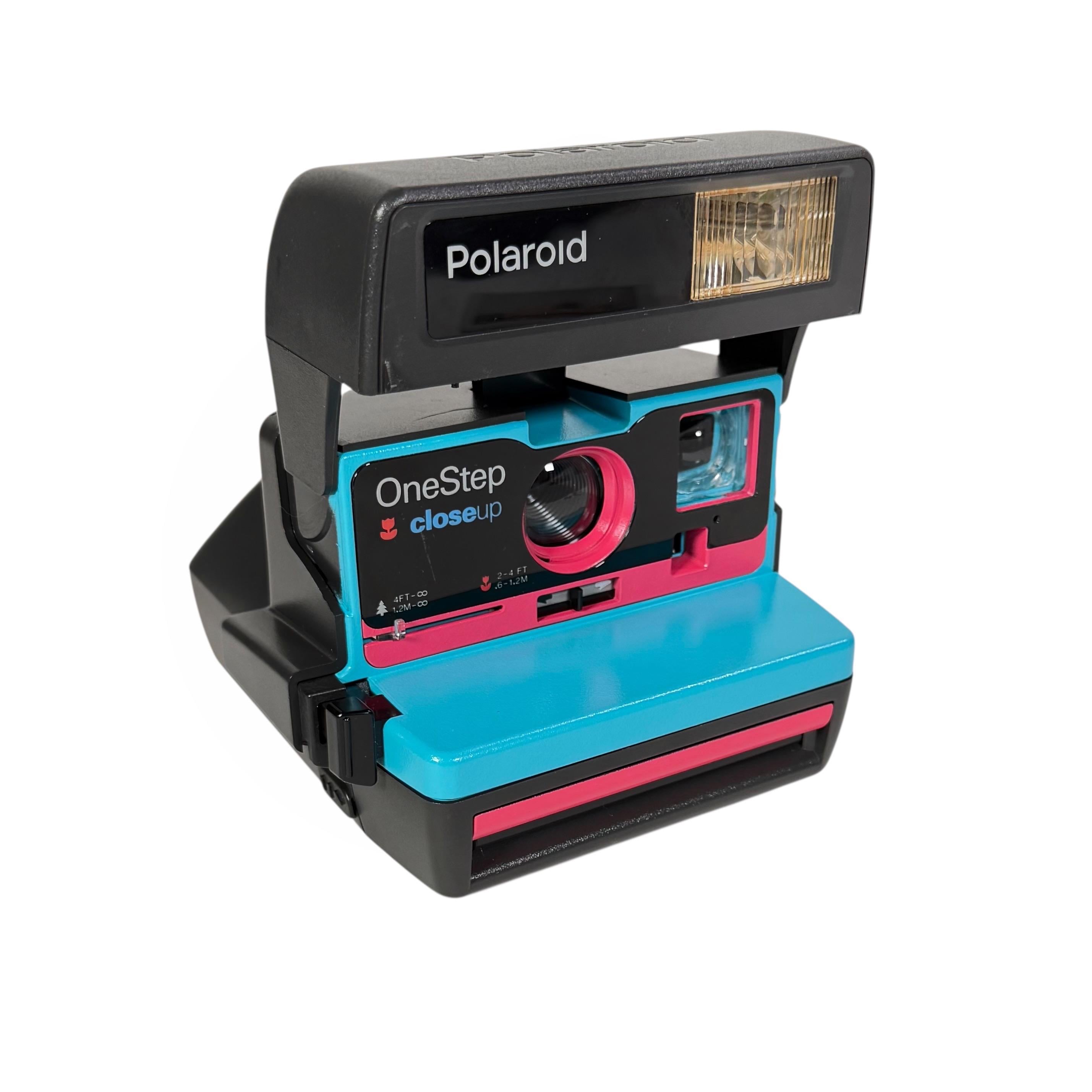 This is a vintage Polaroid 600 OneStep. Opening the camera reveals the lens, flash, close-up lens and light/dark adjustment slider. I replaced worn parts as needed, cleaned the lenses and viewfinder, cleared out the internal workings of the vintage dust, cleaned the rollers, and then updated the face of the camera with pink and turquoise.