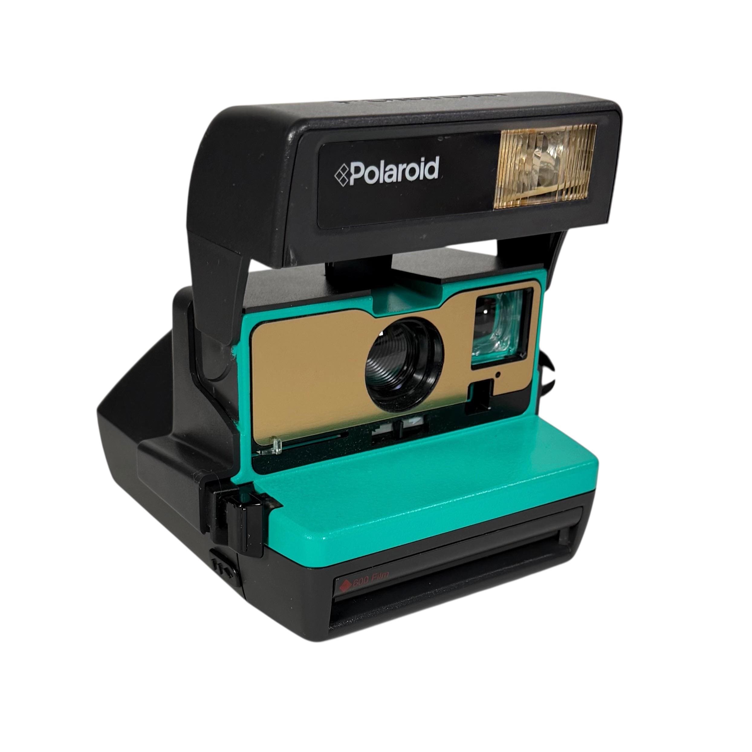 This is a vintage Polaroid 600 OneStep. Opening the camera reveals the lens, flash, close-up lens and light/dark adjustment slider. I replaced worn parts as needed, cleaned the lenses and viewfinder, cleared out the internal workings of the vintage dust, cleaned the rollers, and then updated the face of the camera with Green and Brushhed Gold.