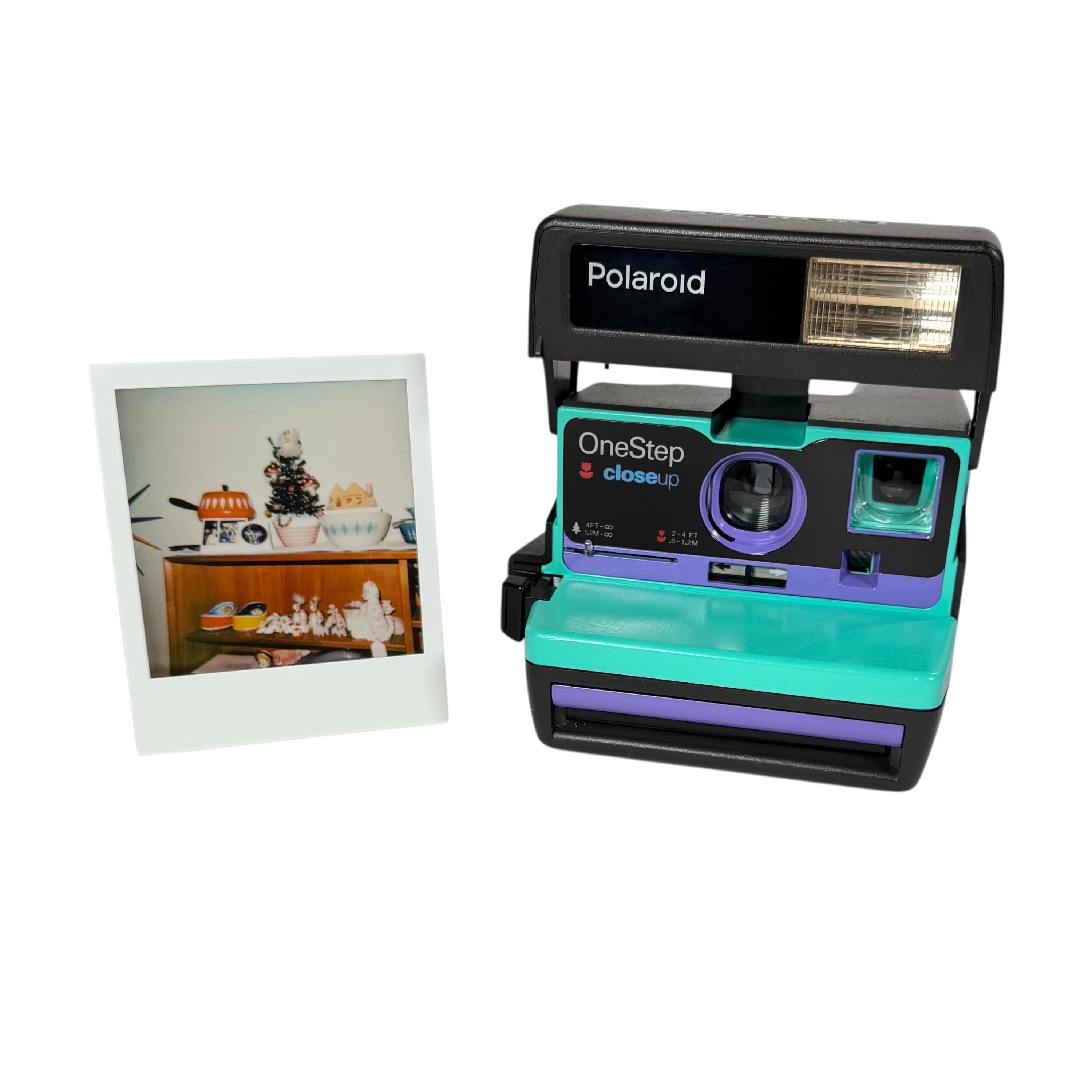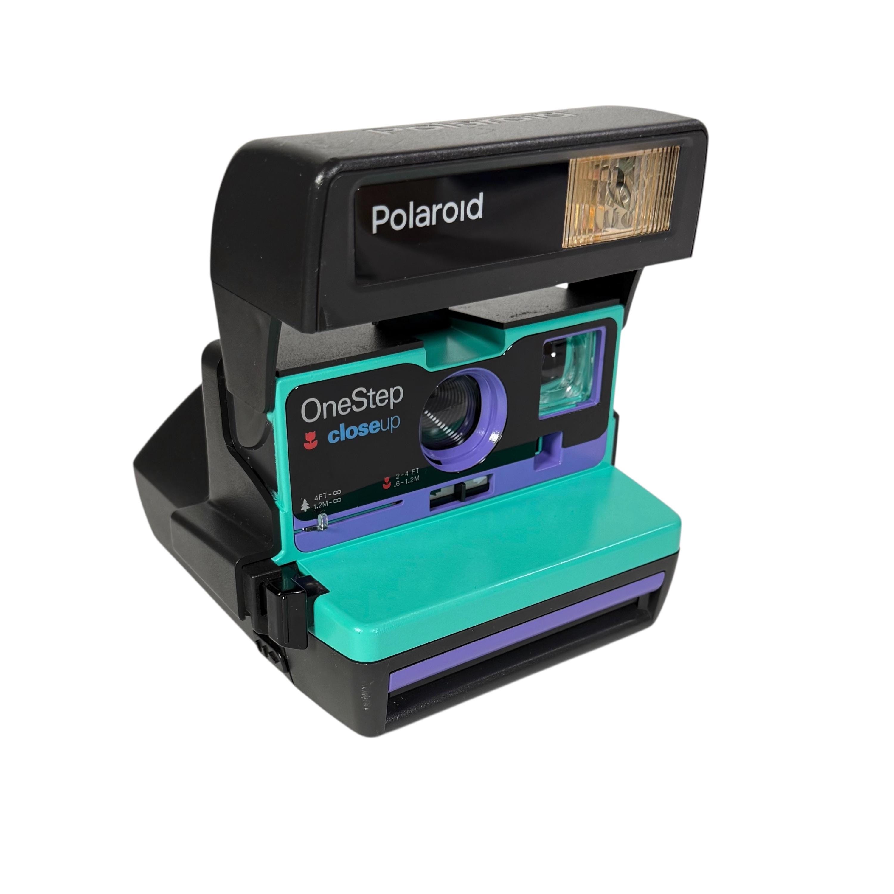 This is a vintage Polaroid 600 OneStep. Opening the camera reveals the lens, flash, close-up lens and light/dark adjustment slider. I replaced worn parts as needed, cleaned the lenses and viewfinder, cleared out the internal workings of the vintage dust, cleaned the rollers, and then updated the face of the camera with Retro Green and Purple.