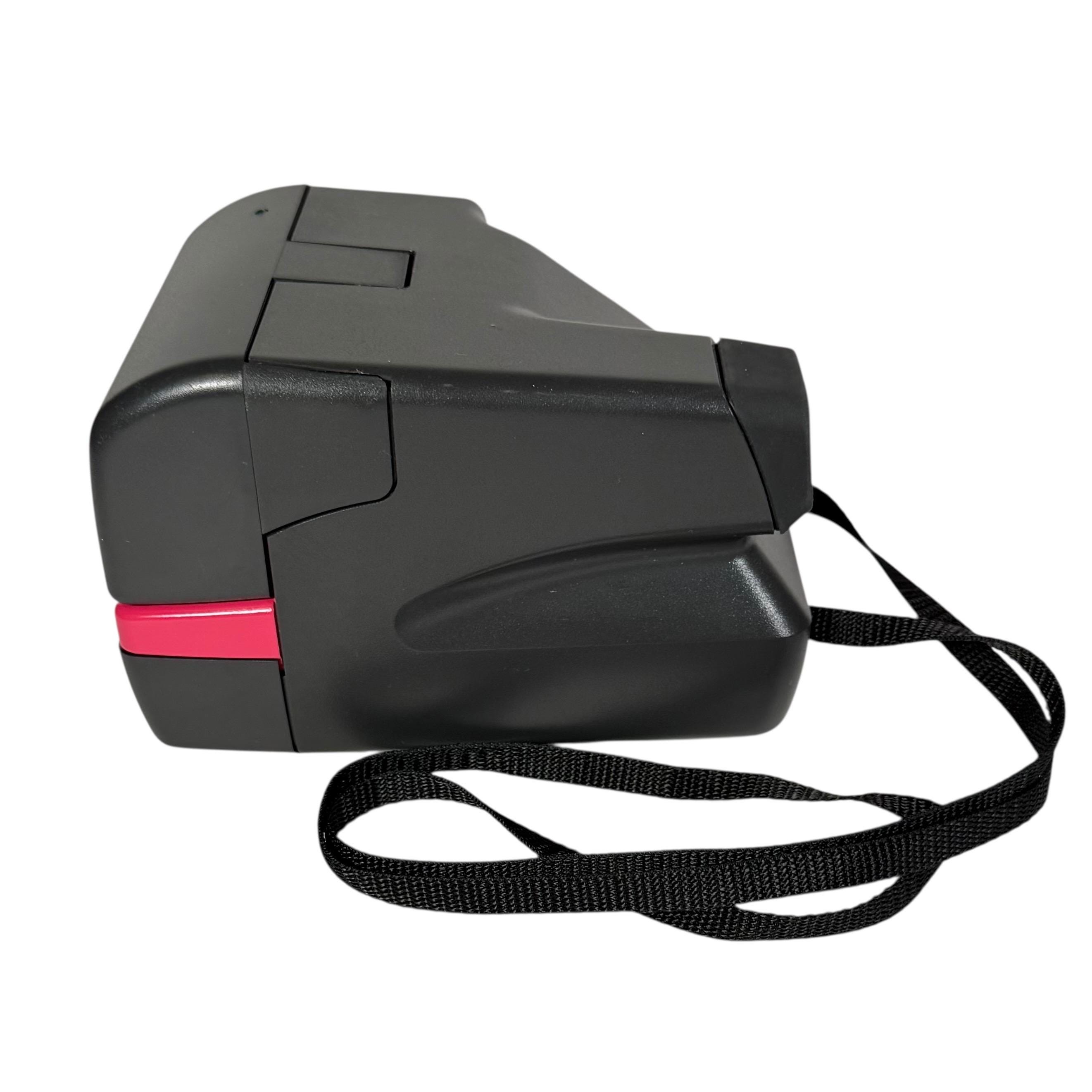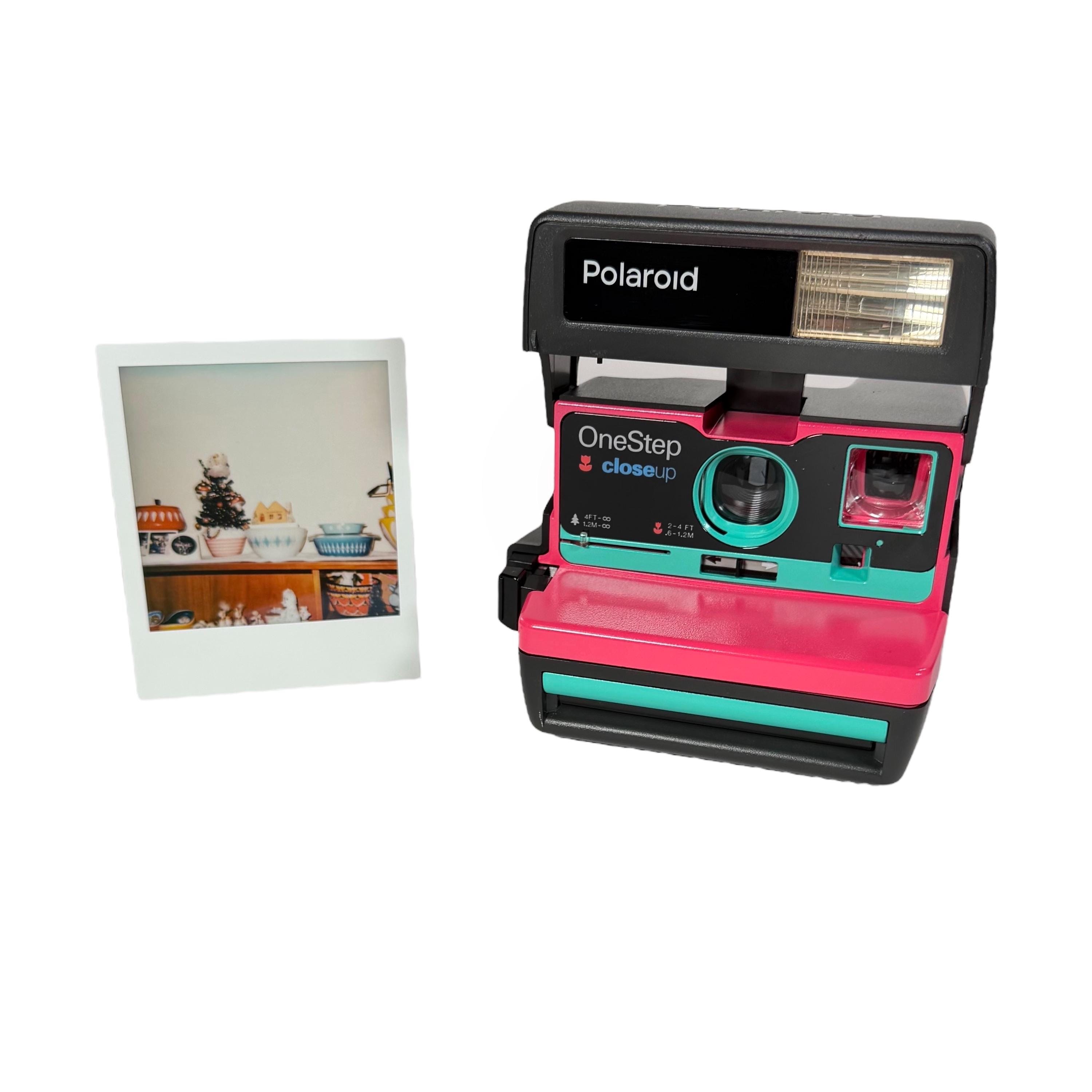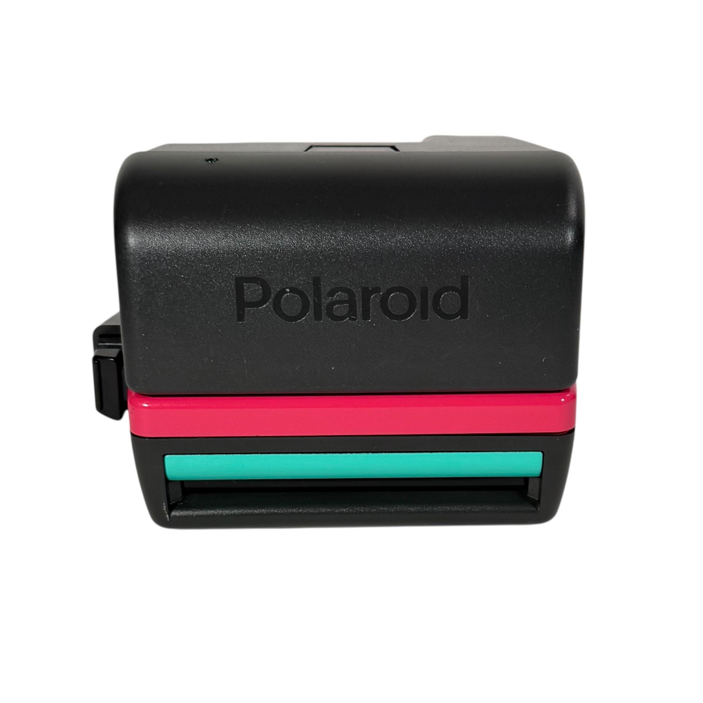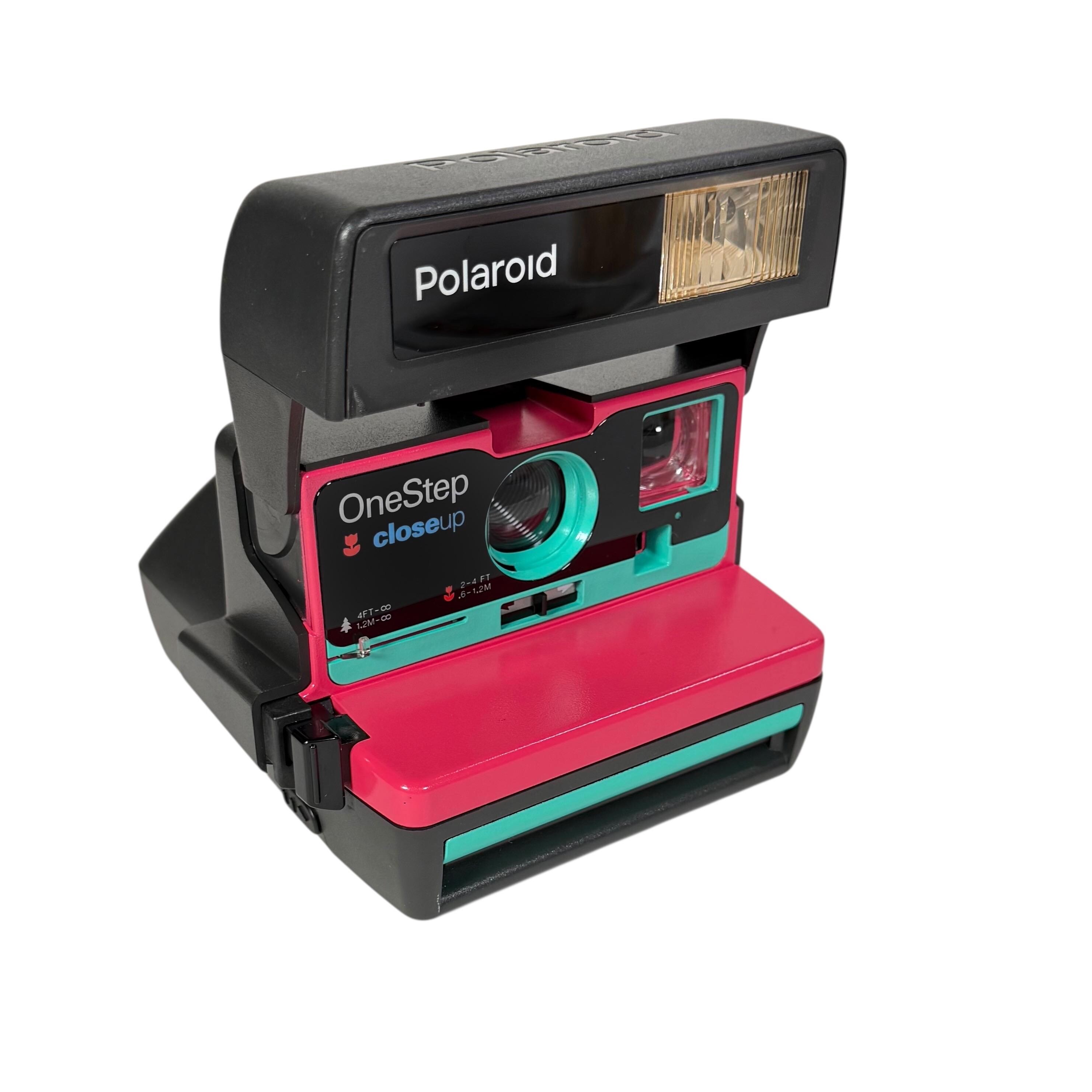 This is a vintage Polaroid 600 OneStep. Opening the camera reveals the lens, flash, close-up lens and light/dark adjustment slider. I replaced worn parts as needed, cleaned the lenses and viewfinder, cleared out the internal workings of the vintage dust, cleaned the rollers, and then updated the face of the camera with pink and retro green.