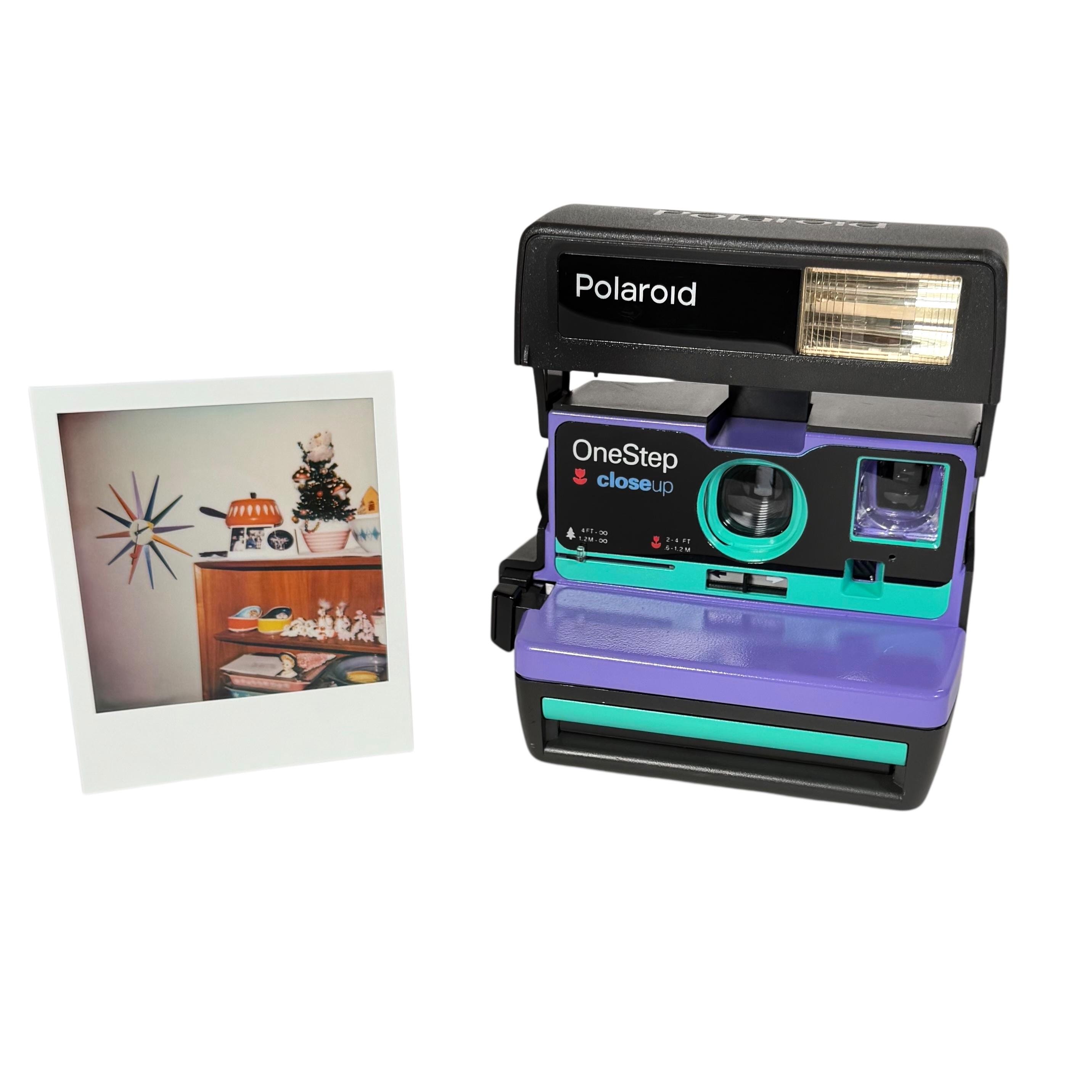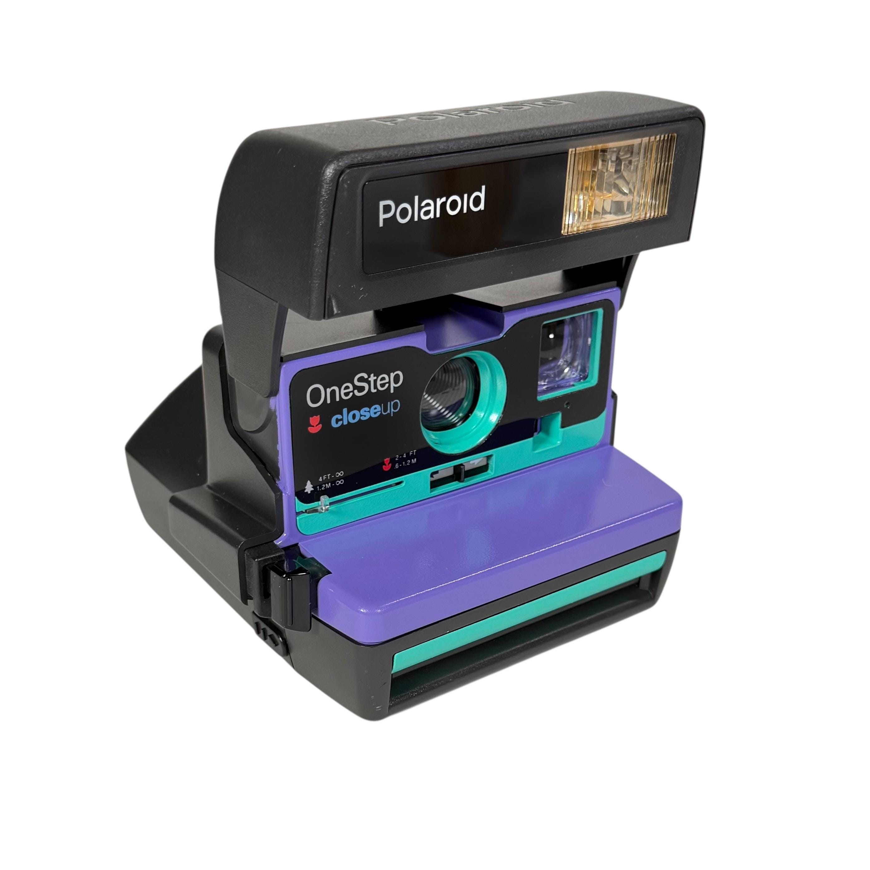 This is a vintage Polaroid 600 OneStep. Opening the camera reveals the lens, flash, close-up lens and light/dark adjustment slider. I replaced worn parts as needed, cleaned the lenses and viewfinder, cleared out the internal workings of the vintage dust, cleaned the rollers, and then updated the face of the camera with Purple and Retro Green.