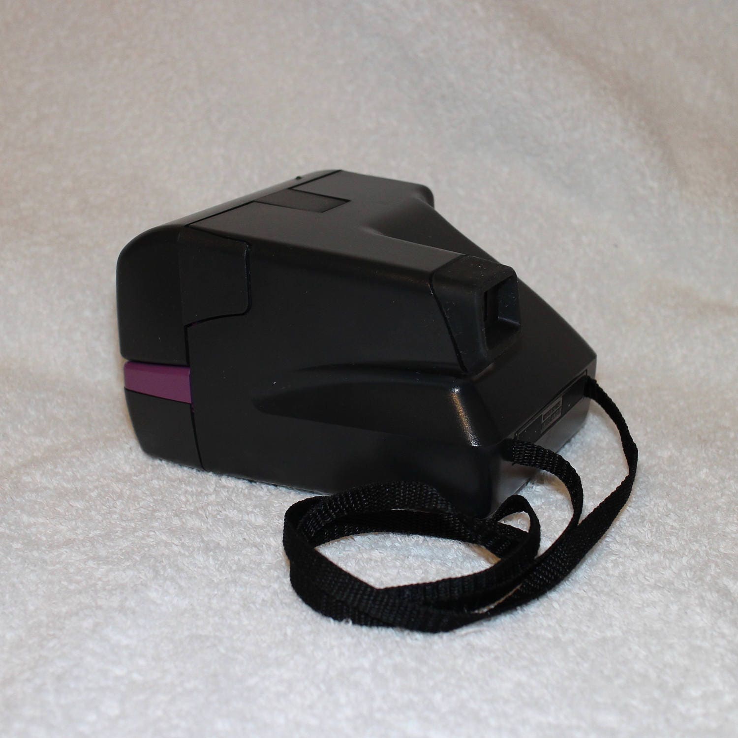 This is a vintage Polaroid 600 OneStep. Flipping open the front of the camera reveals its lens, flash, close-up lens and light/dark adjustment slider. I cleaned the lenses and viewfinder, cleared out the internal workings of any vintage dust, replaced worn parts as needed, cleaned the rollers, and then updated with a bit of fun Purple, Pink and Blue.