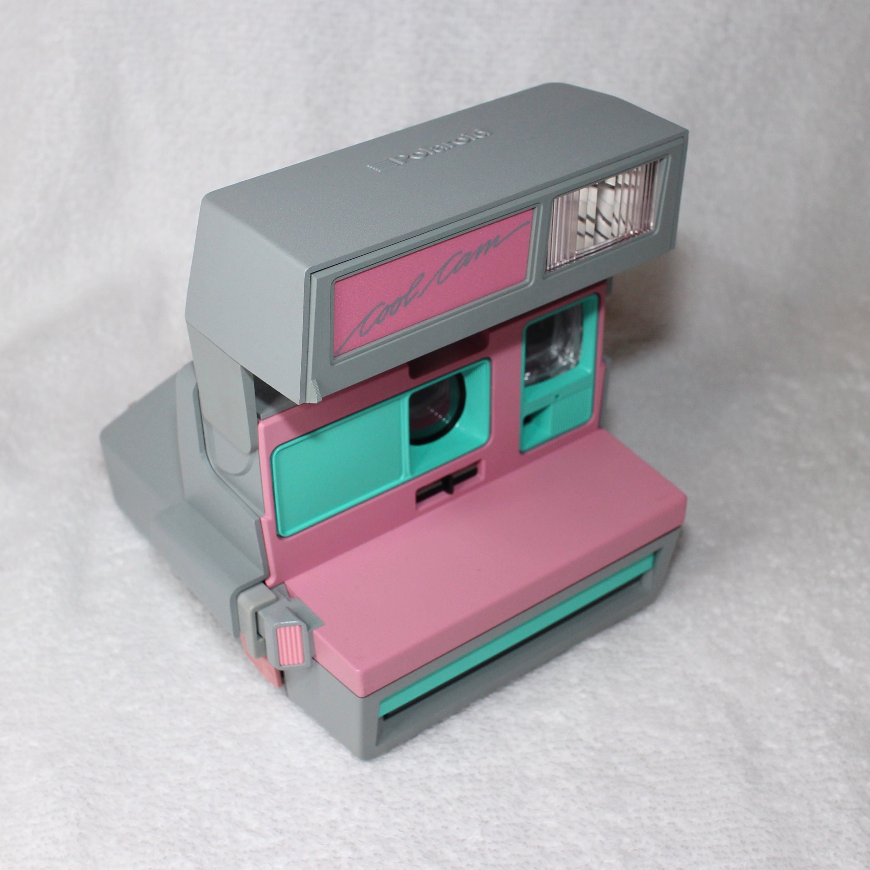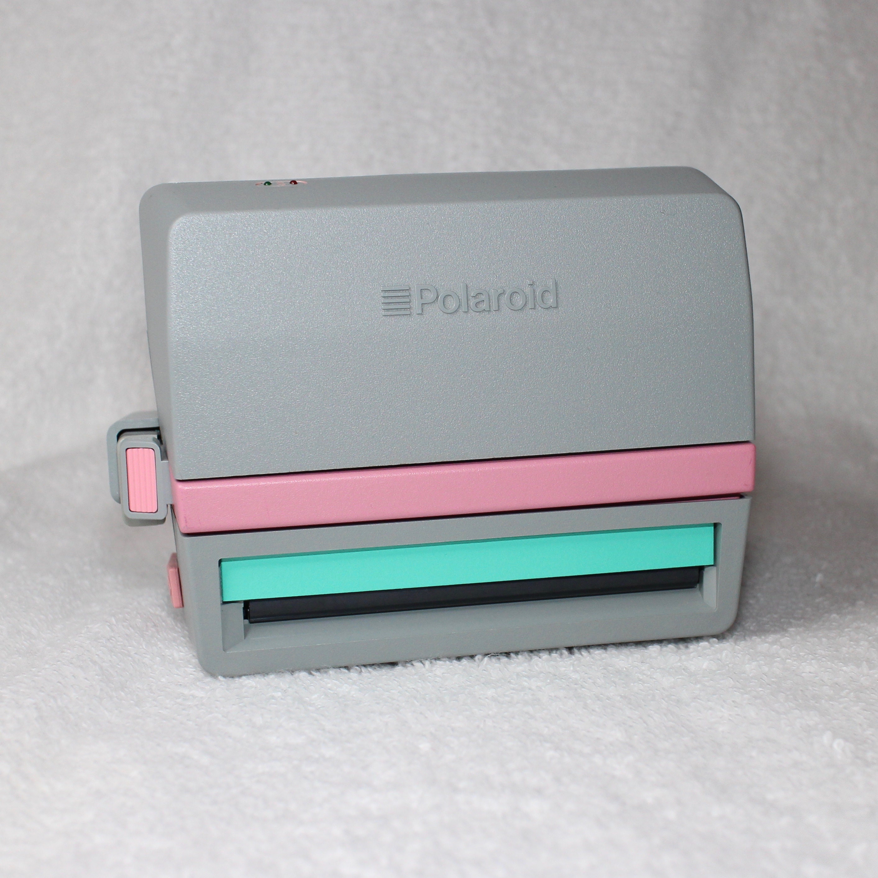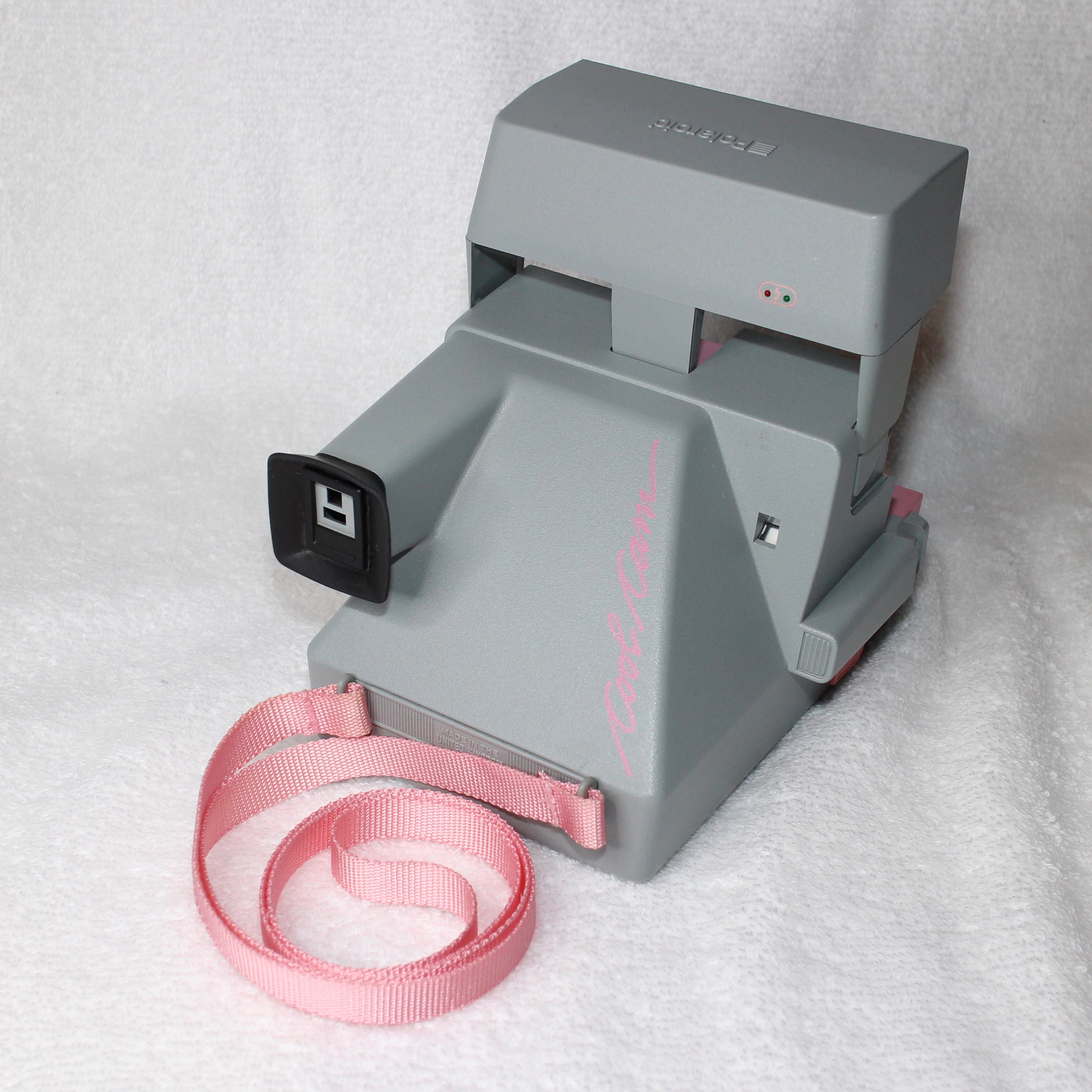 The Pink Cool Cam Polaroid 600 has the familiar Polaroid original pink face, pink neck strap, pink shutter button, pink Cool Cam text and Gray body. I upcycled the camera with the addition of Retro Green.