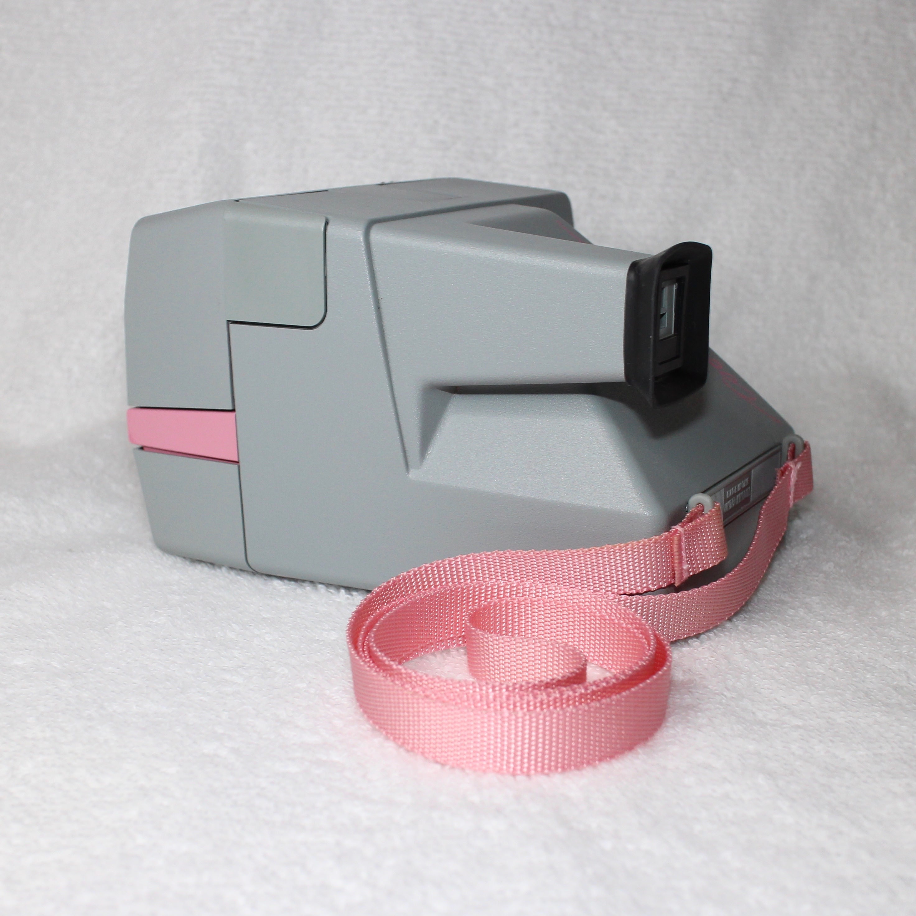 This Polaroid has the original Pink neck strap and rubber view finder eye piece. I cleaned the rollers, lenses, cleared out vintage dust, and replaced worn internal components as needed. There is a slider on the front of the camera to get a better shot when the background of the photographed area is over bright or over dark.