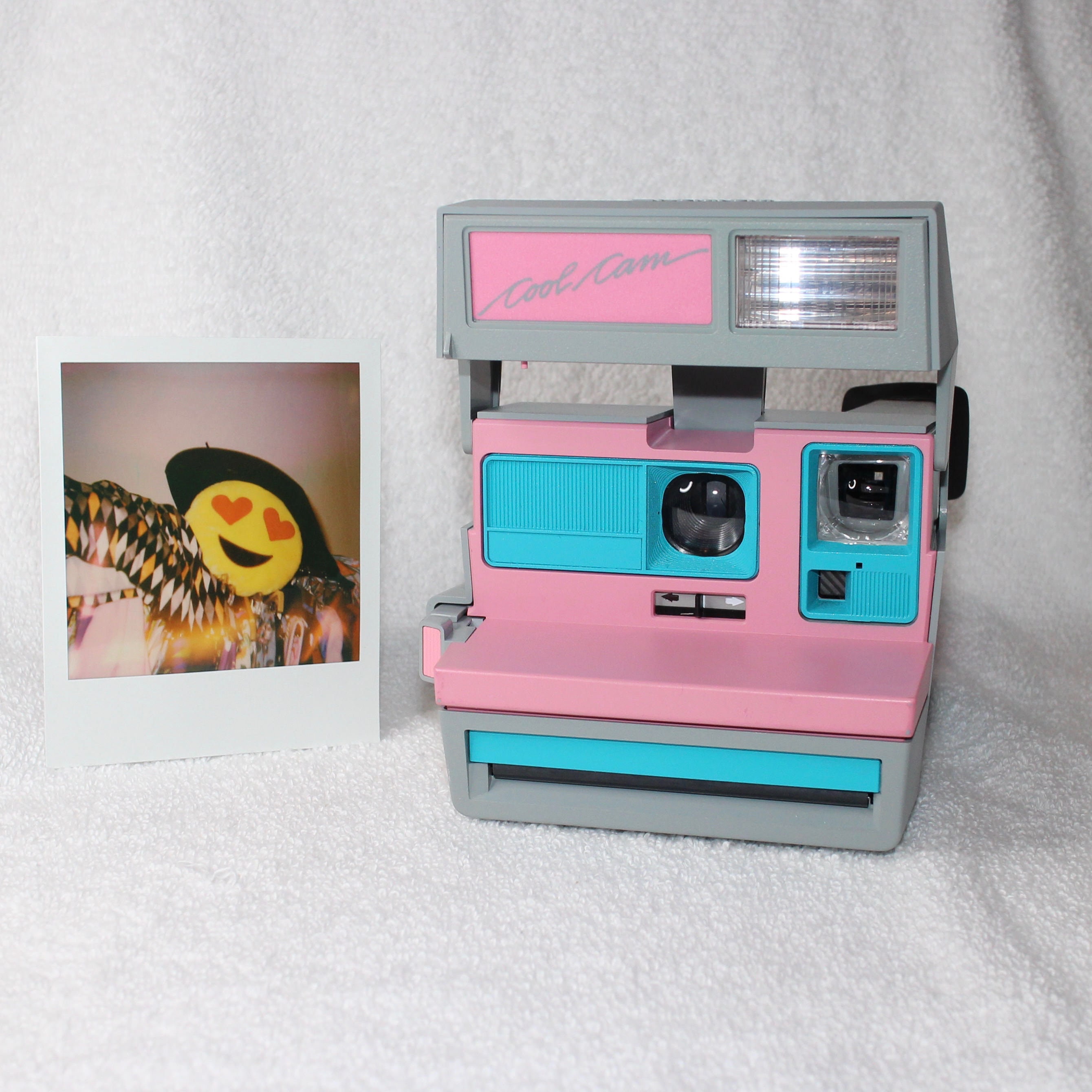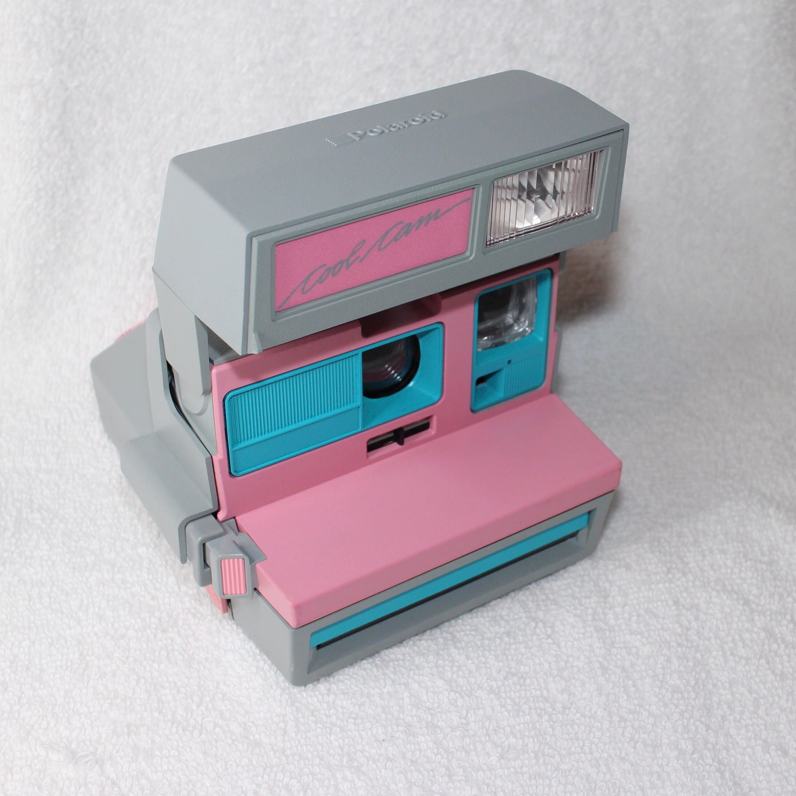 The Pink Cool Cam Polaroid 600 has the familiar Polaroid original pink face, pink neck strap, pink shutter button, pink Cool Cam text and Gray body. I upcycled the camera when I had it apart to clean and tune with the addition of Turquoise.