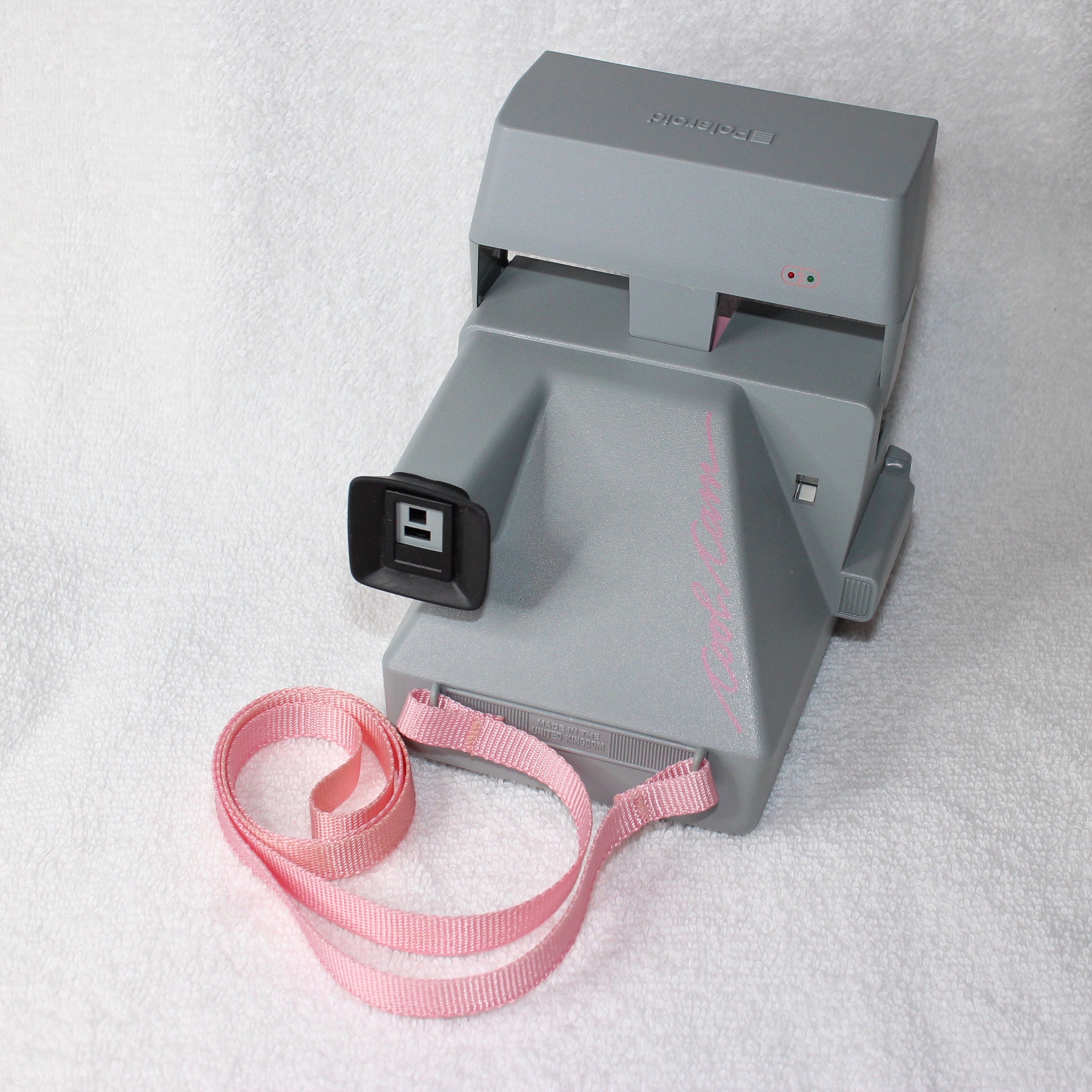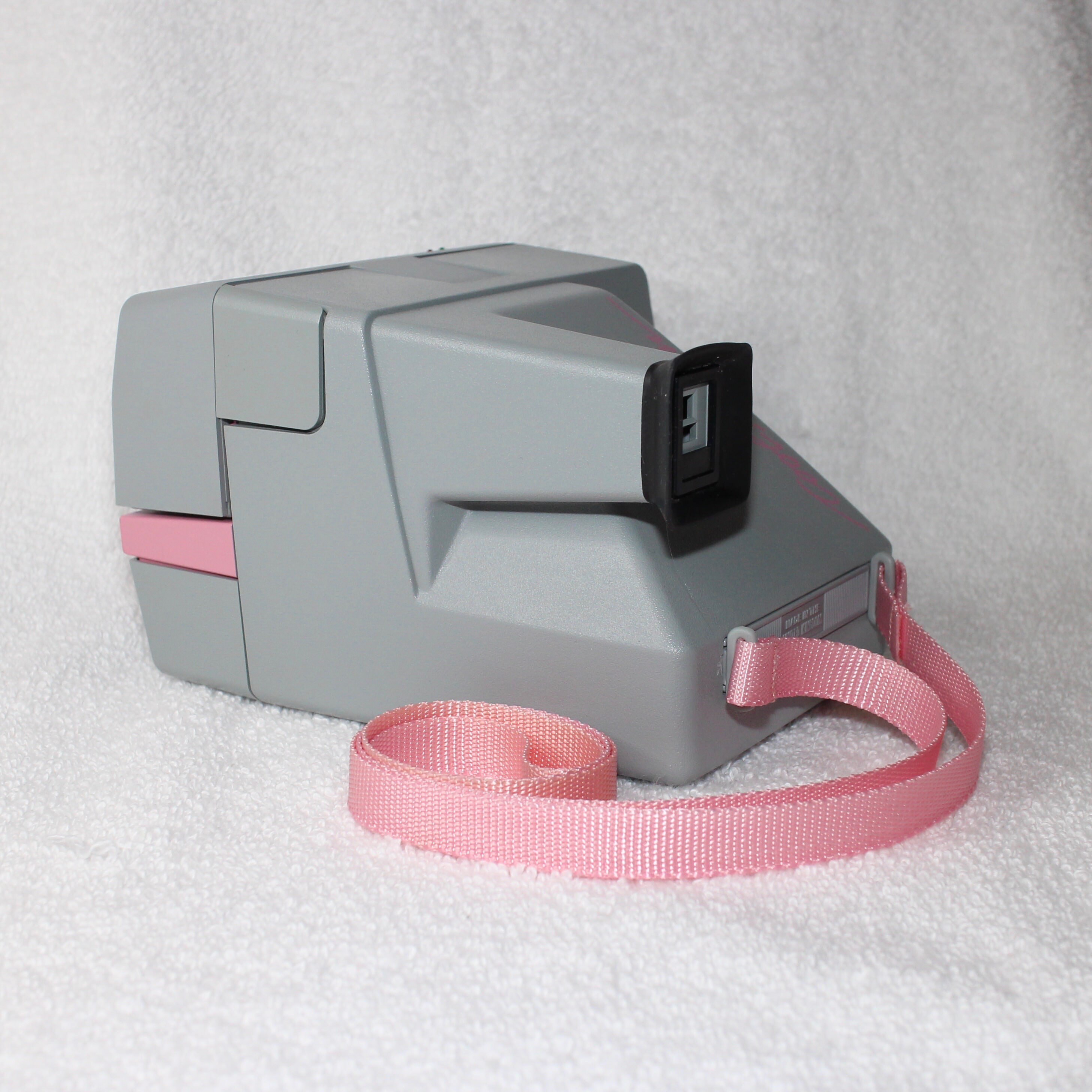 This Polaroid has the original Pink neck strap and rubber view finder eye piece. I cleaned the rollers, lenses, cleared out vintage dust, tested and replaced the internal components as needed. There is a slider on the front of the camera to get a better shot when the background of the photographed area is over bright or over dark.