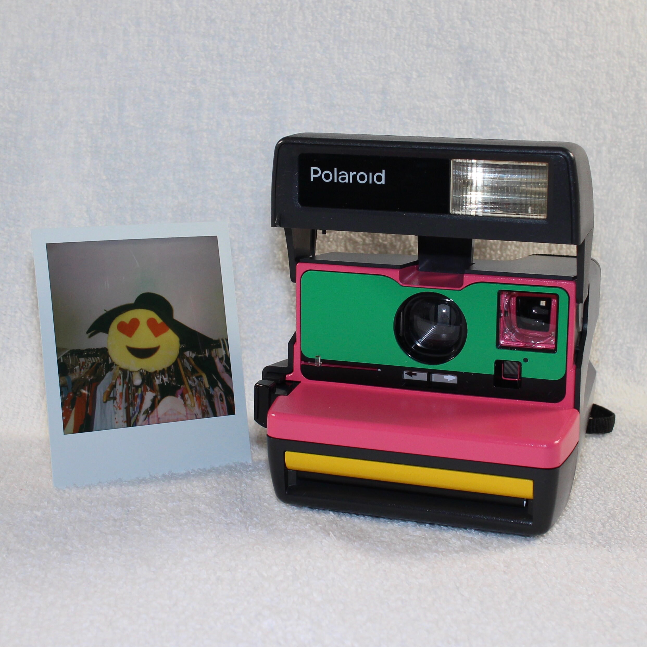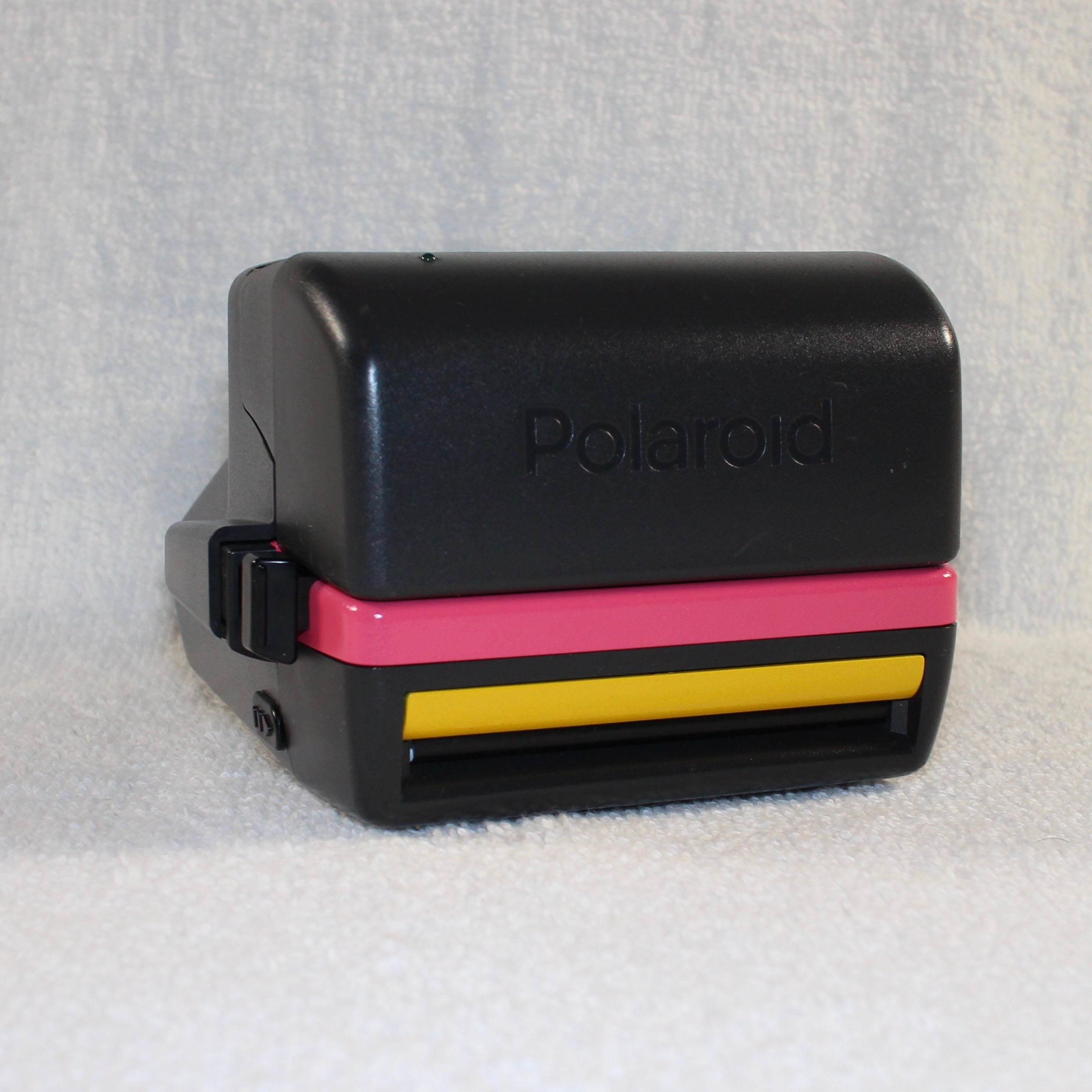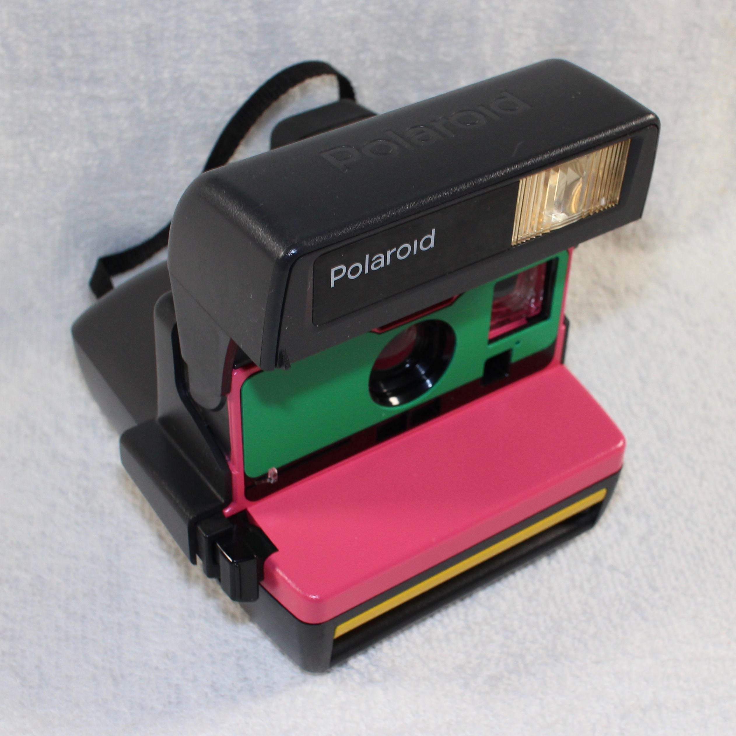 This is a vintage Polaroid 600 OneStep. Opening the camera reveals the lens, flash, close-up lens and light/dark adjustment slider. I cleaned the lenses and viewfinder, cleared out the internal workings of any vintage dust and replaced worn parts as needed, cleaned the rollers, and then updated with a bit of fun Pink, Green and Yellow.