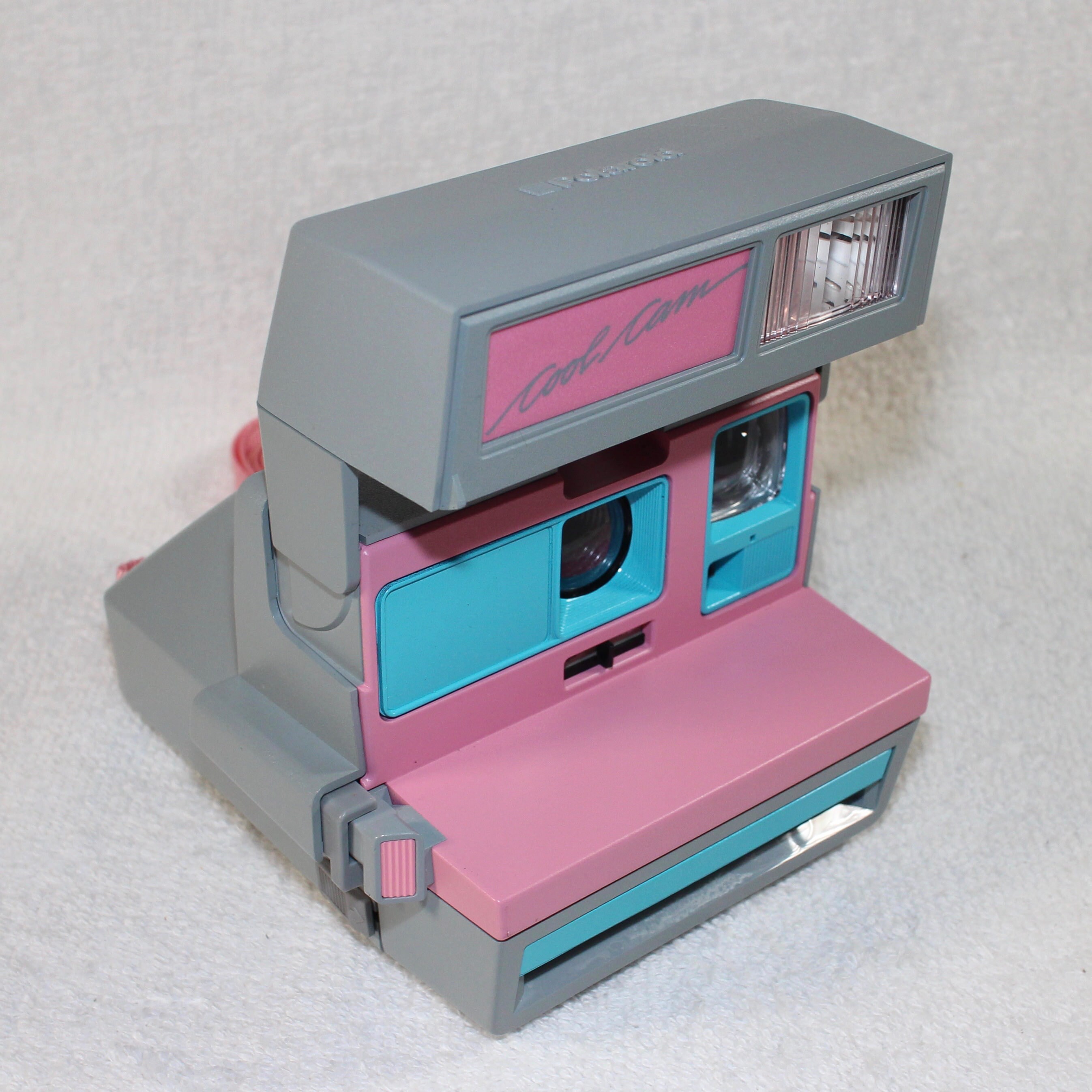 The Pink Cool Cam Polaroid 600 has the familiar Polaroid original pink face, pink neck strap, pink shutter button, pink Cool Cam text and Gray body. I upcycled the camera when I had it apart to clean and tune with the addition of Turquoise.