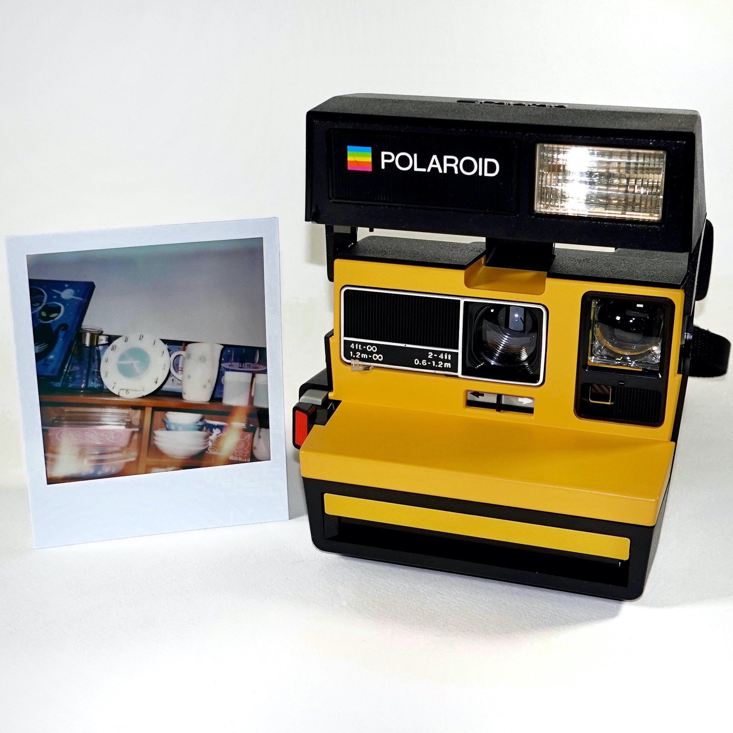 This camera produces either Color or Black-and-White prints depending on the film cartridge you use. Next to the camera is a photo print I just took with this camera using New Color Polaroid Originals type 600 film.