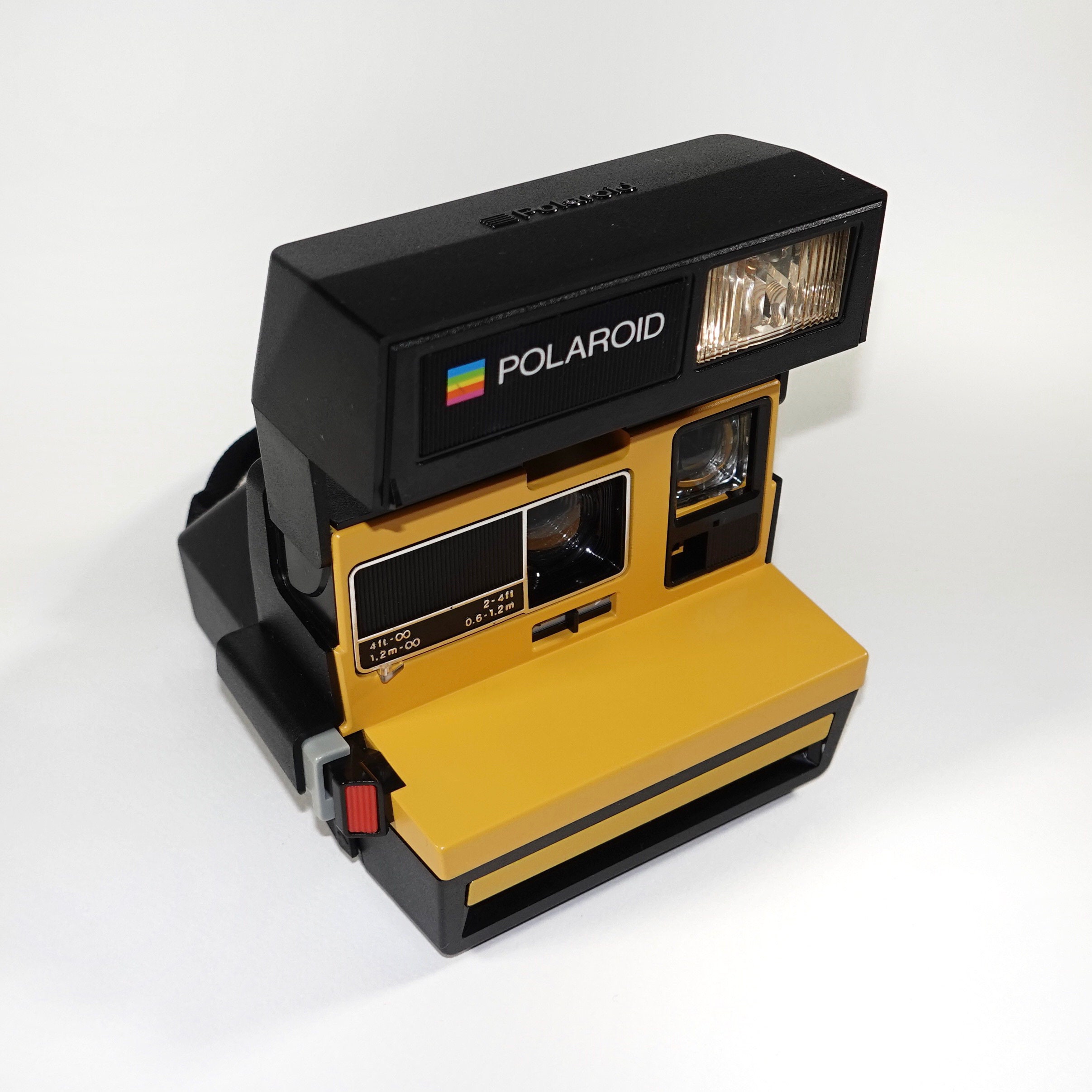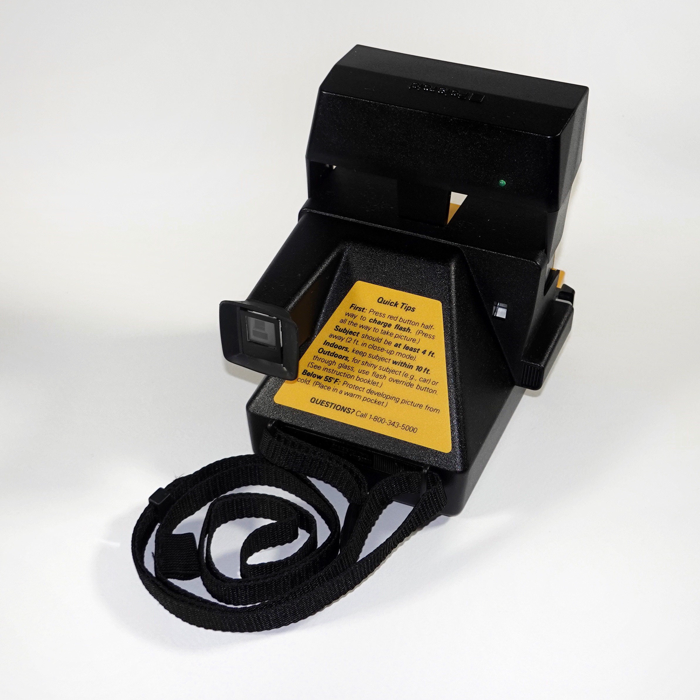 This camera has a Polaroid factory adjustable neck strap, rubber view finder eye part and working shot counter. I cleaned the rollers, replaced worn internal mechanical components as needed, and cleaned the lenses. There is a slider on the front of the camera to use to get a photo when the background of the photographed area is over bright or over dark.