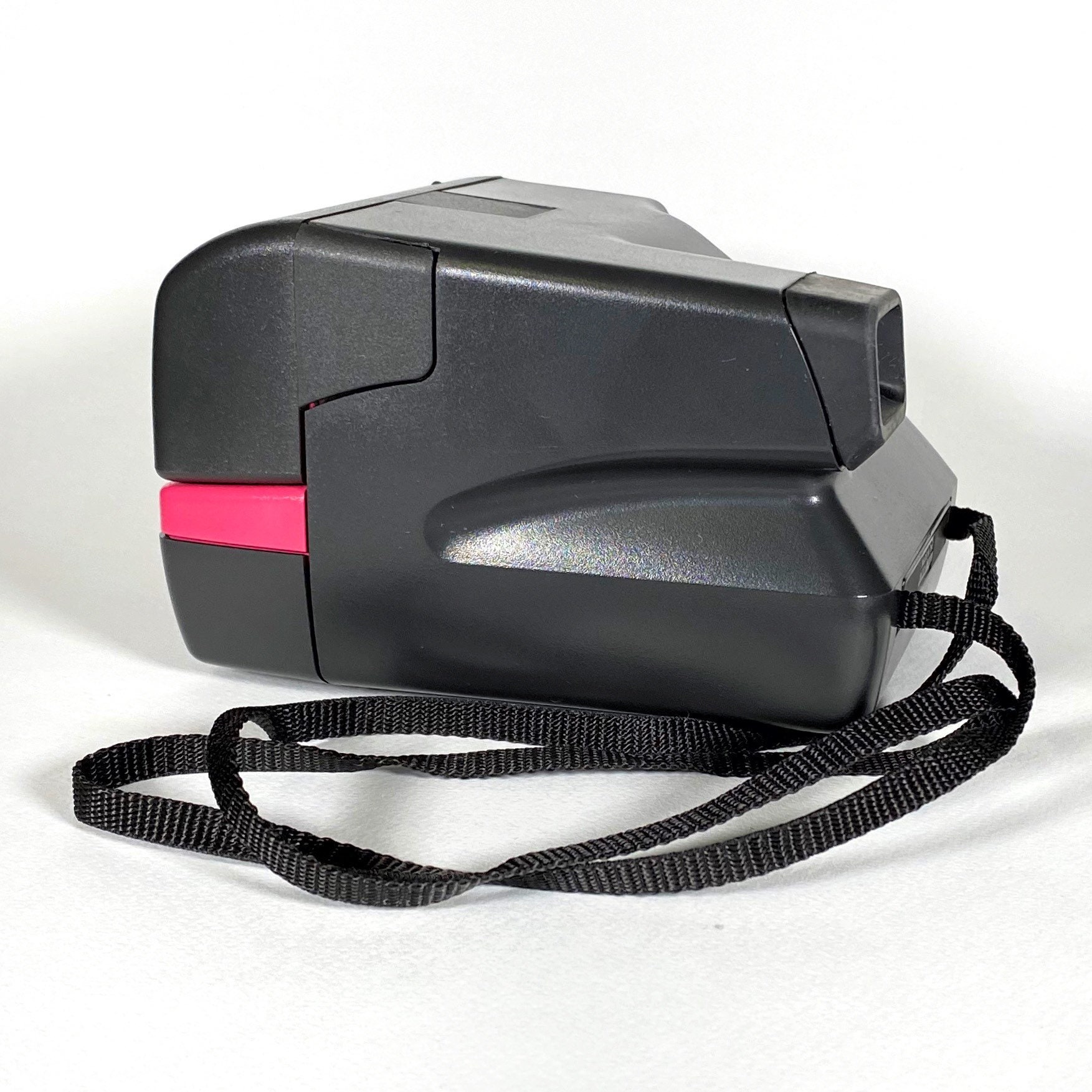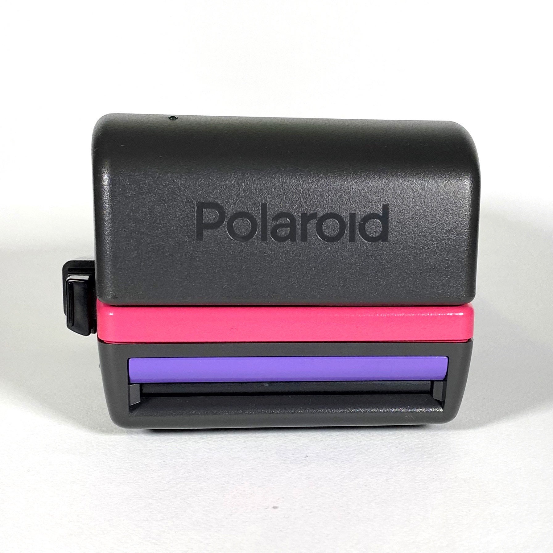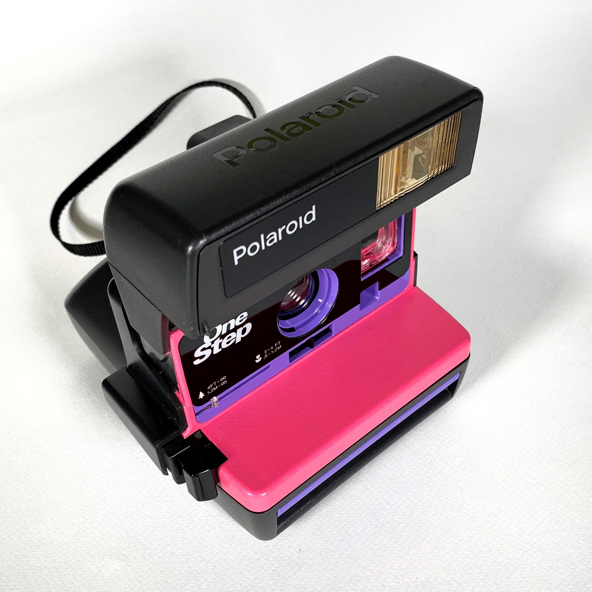 This is a vintage Polaroid 600 OneStep. Flipping open the front of the camera reveals its lens, flash, close-up lens and light/dark adjustment slider. I replaced worn parts as needed, cleaned the lenses and viewfinder, cleared out the internal workings of any vintage dust, cleaned the rollers, and then updated with a bit of fun Pink and Purple.