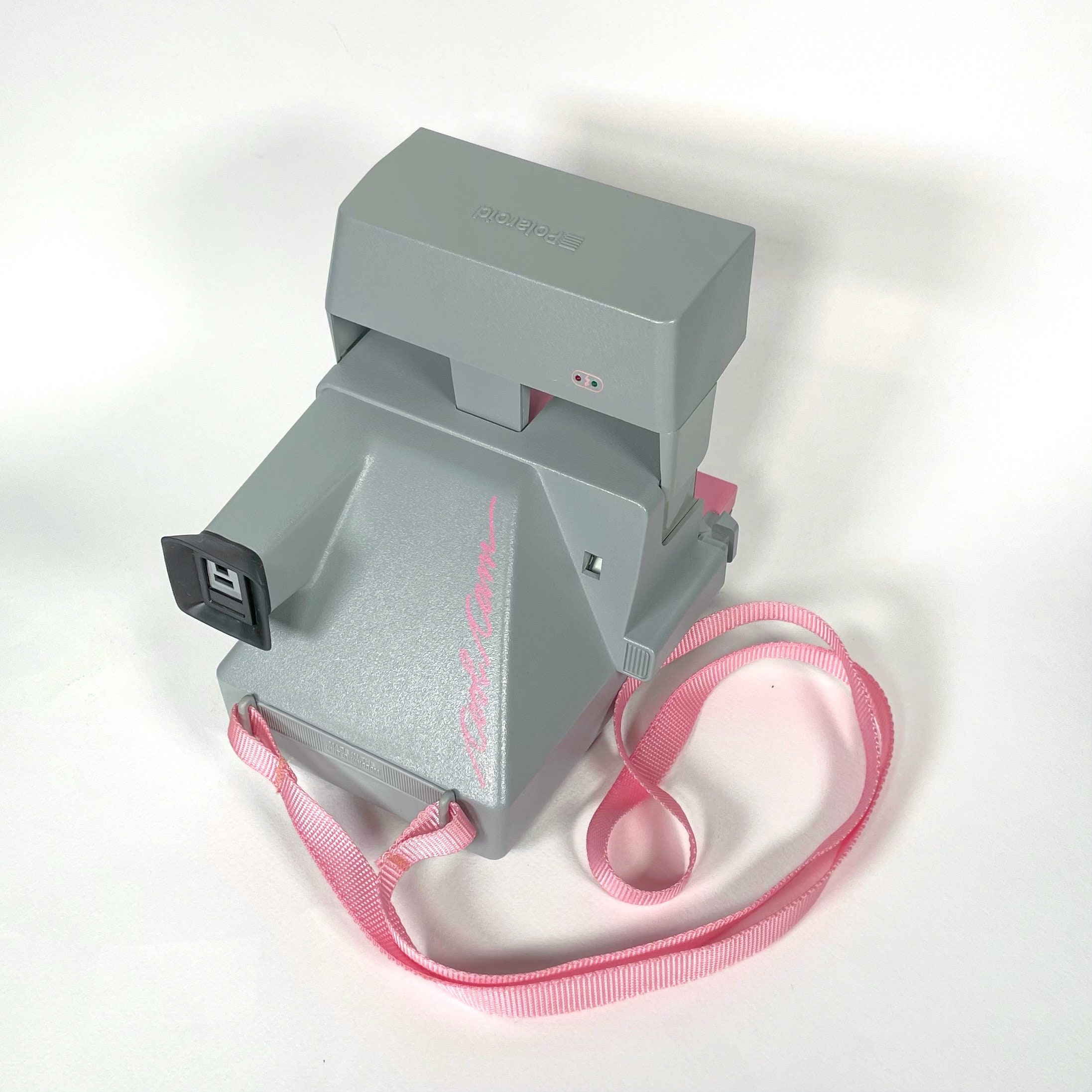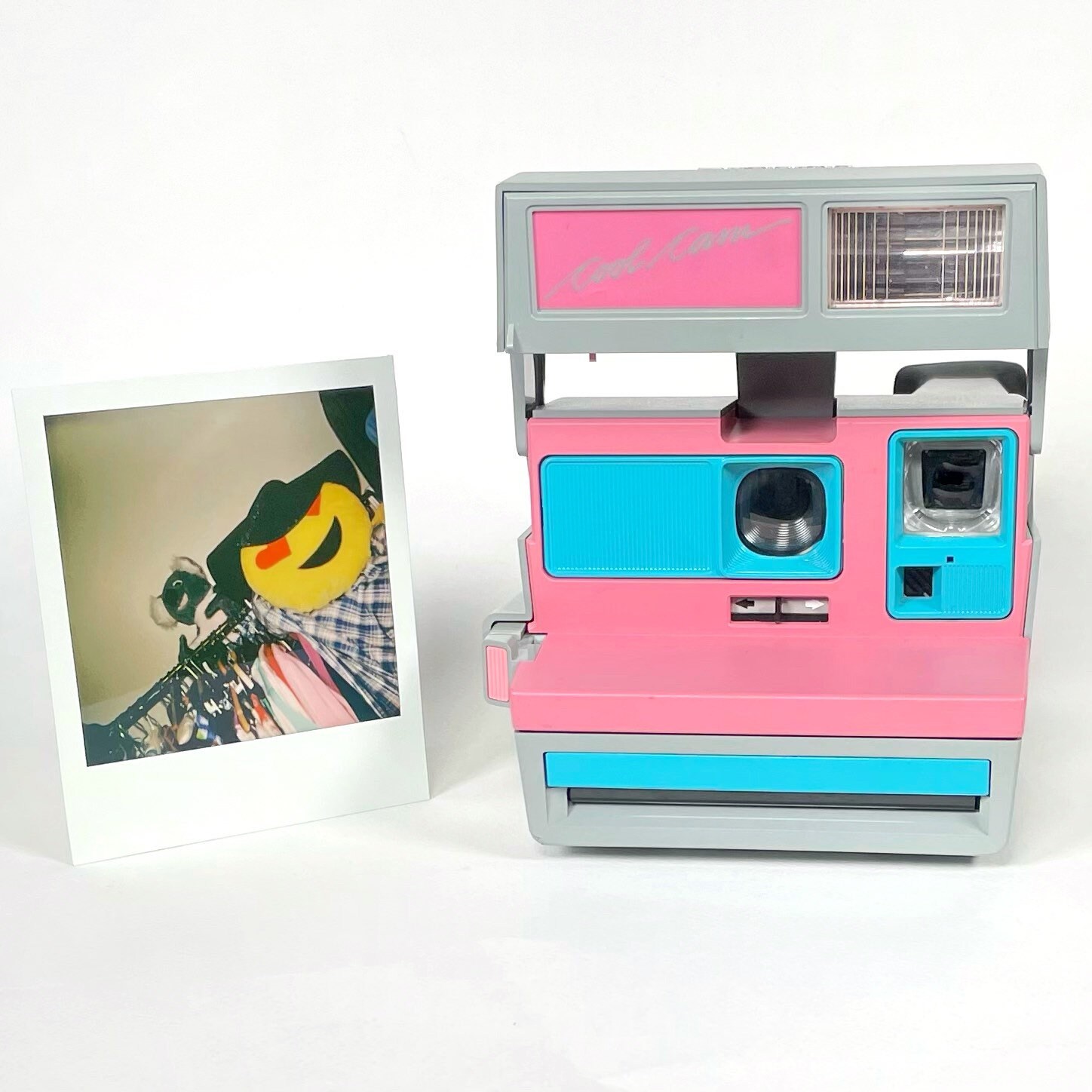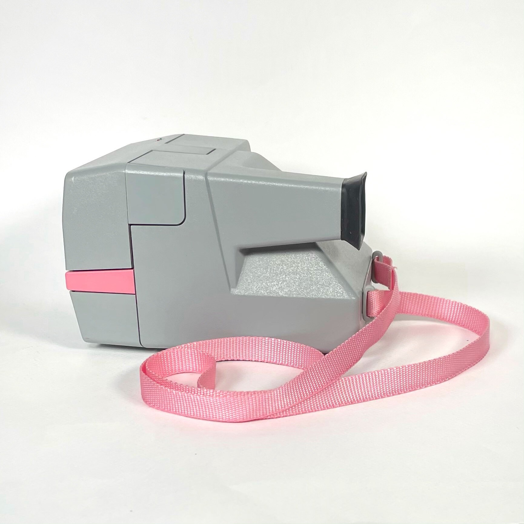The Pink Cool Cam Polaroid 600 has the familiar Polaroid original pink face, pink neck strap, pink shutter button, pink Cool Cam text and Gray body. I upcycled the camera when I had it apart to clean and tune with the addition of Turquoise.